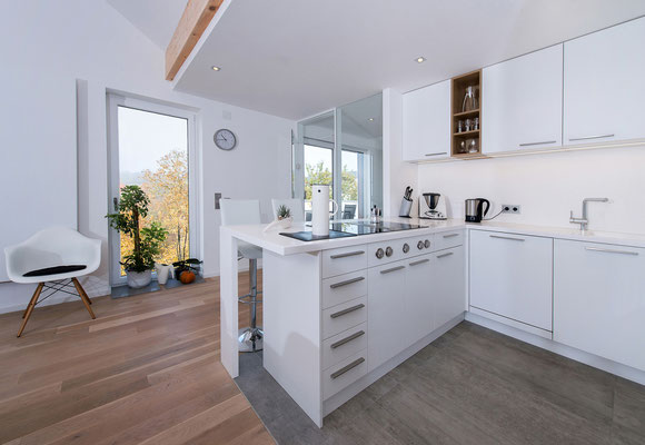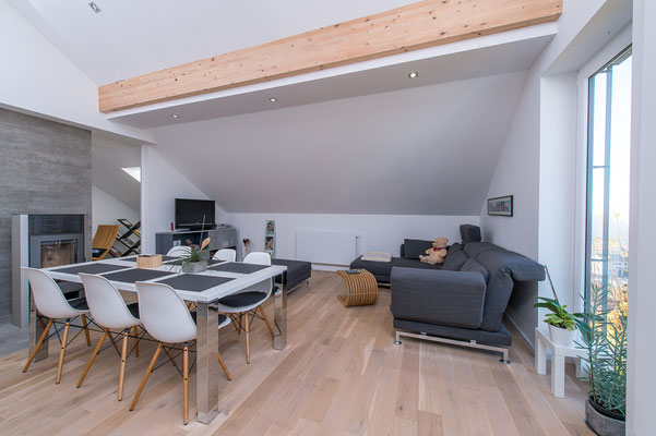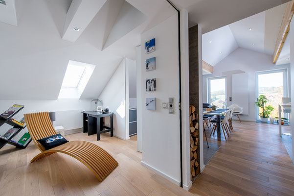 Energetische Dachsanierung mit Büroanbau zu einer modernen Wohnsituation im Dachgeschoss mit verschiebbaren Wandelementen inkl. kompletter Möbelplanung. Die Wohnung kann dadurch variabel genutzt und die Größe der Räume angepasst werden.